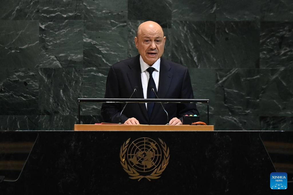 Chief of Yemen's Presidential Leadership Council Rashad al-Alimi delivers a speech during the General Debate of the 80th session of the United Nations General Assembly (UNGA) at the UN headquarters in New York, on Sept. 25, 2025. (Xinhua/Li Rui)