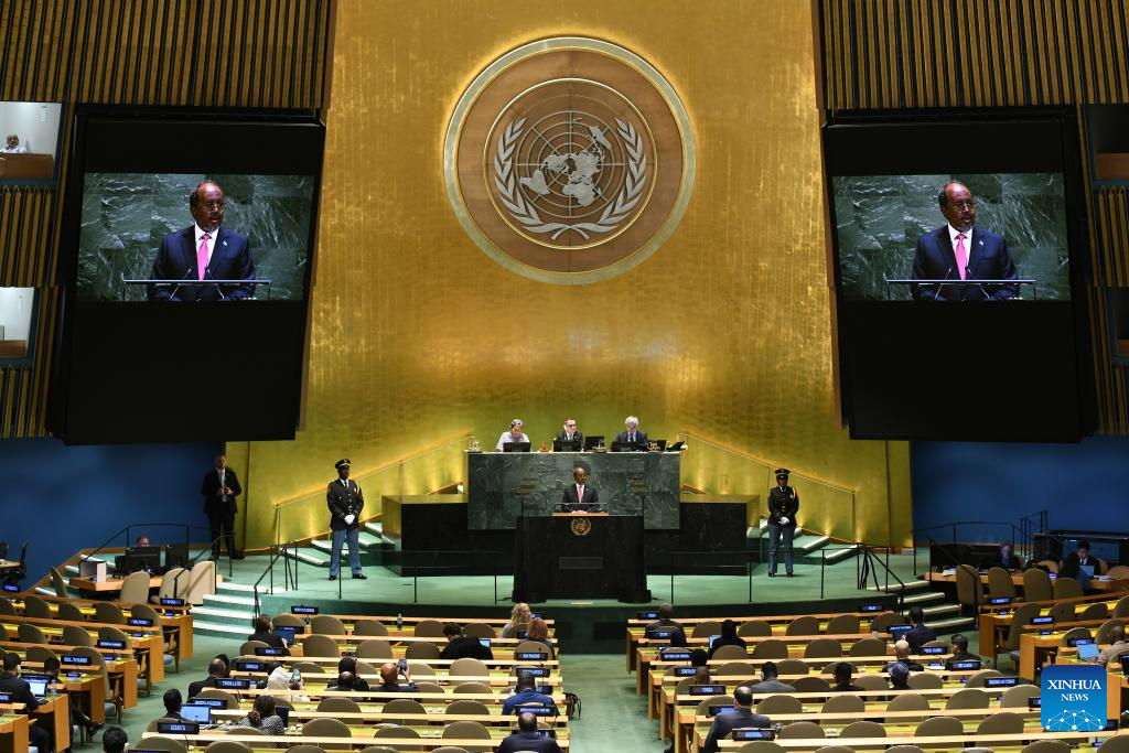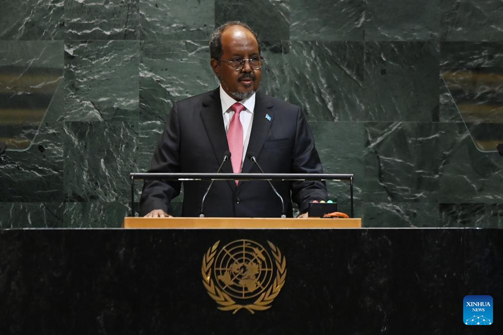 Somali President Hassan Sheikh Mohamud delivers a speech during the General Debate of the 80th session of the United Nations General Assembly (UNGA) at the UN headquarters in New York, on Sept. 25, 2025. (Xinhua/Li Rui)
