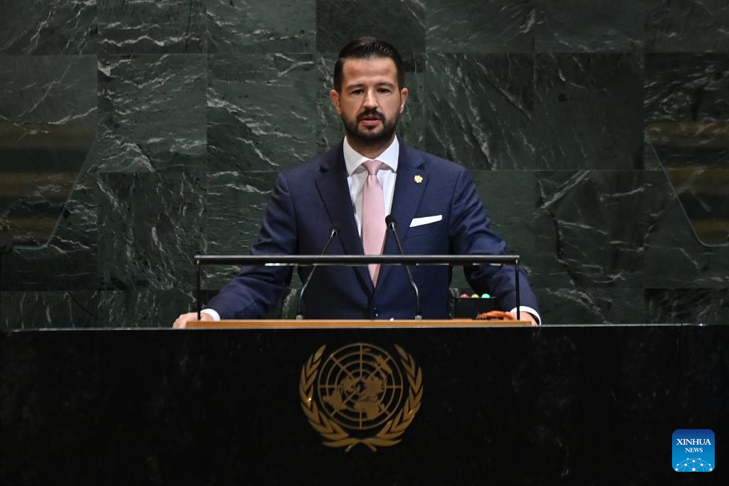 Montenegrin President Jakov Milatovic delivers a speech during the General Debate of the 80th session of the United Nations General Assembly (UNGA) at the UN headquarters in New York, on Sept. 25, 2025. (Xinhua/Li Rui)