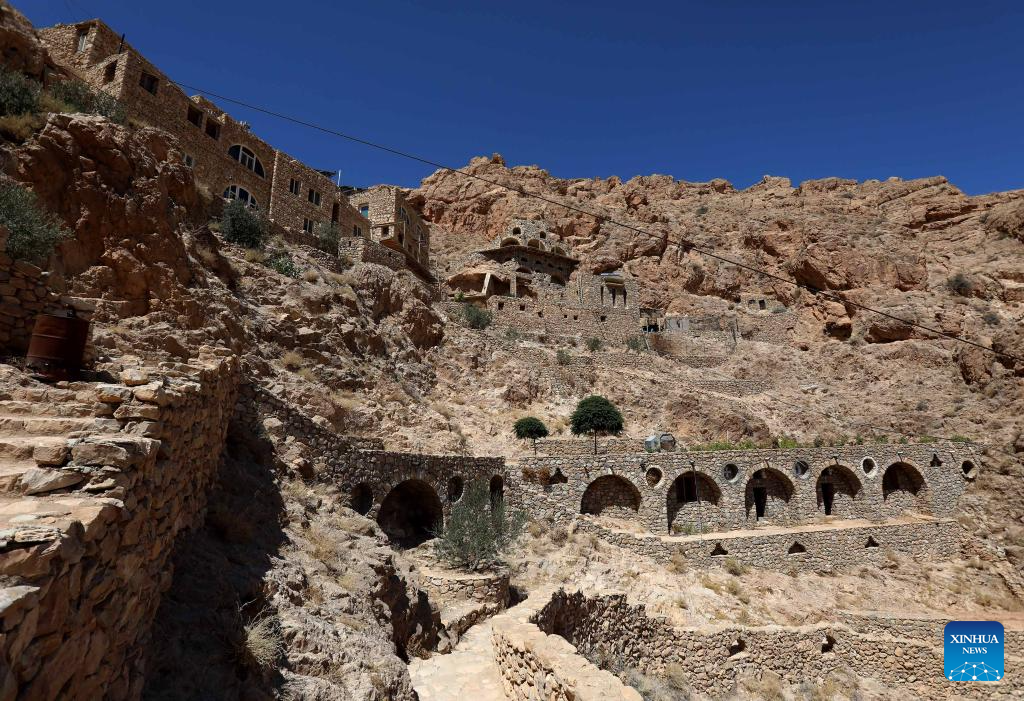This photo taken on Sept. 22, 2025 shows a panoramic view of Deir Mar Musa al-Habashi, an ancient Syriac Catholic monastery, in the Qalamoun mountains, north of Damascus, Syria. (Photo by Ammar Safarjalani/Xinhua)