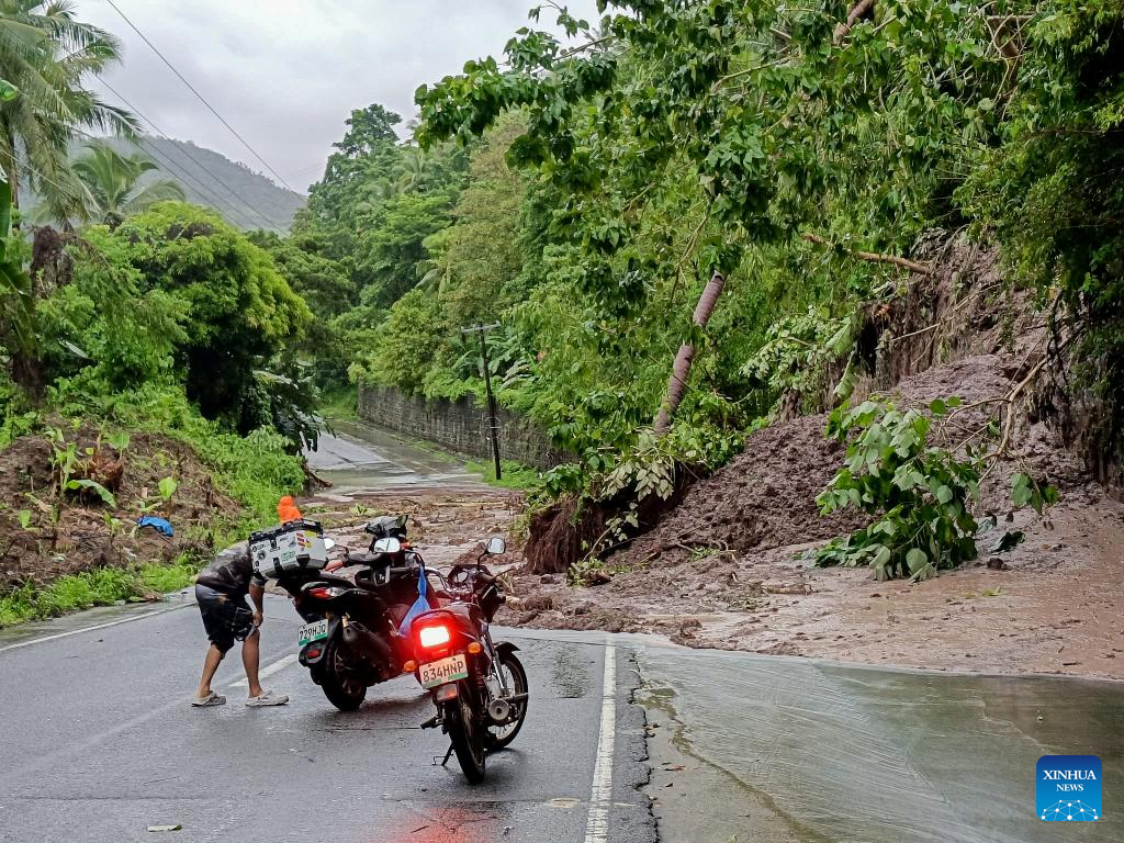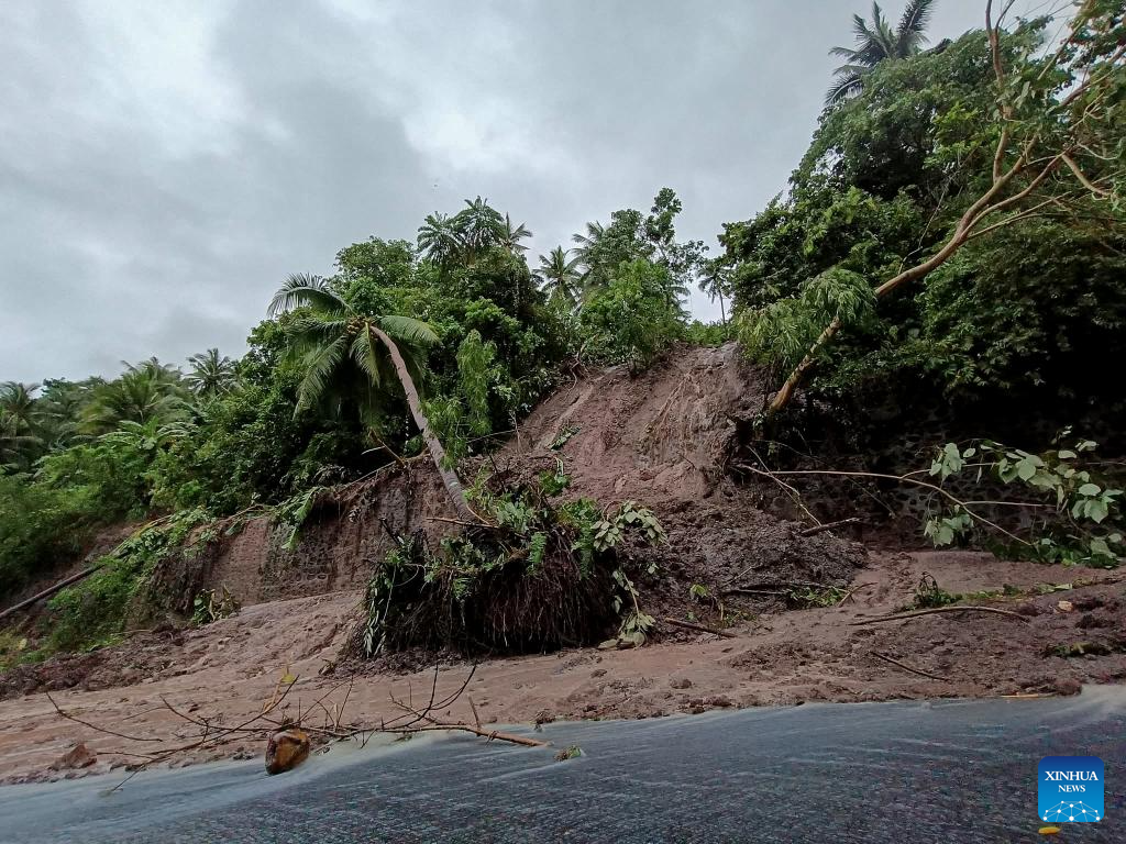 A road is blocked by a landslide due to tropical storm Bualoi in Leyte Province, the Philippines, Sept. 26, 2025. Authorities have recorded four deaths as severe tropical storm Bualoi continues to barrel through the Philippines after making landfall on Thursday, the country's Office of Civil Defense (OCD) said on Friday. (Leyte LGU/Handout via Xinhua)