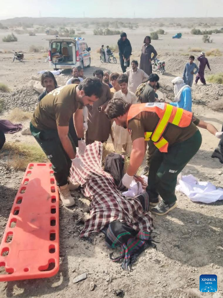 This photo taken with a mobile phone shows rescuers removing a body from the road accident site in Panjgur district of Pakistan's southwest Balochistan province on Sept. 27, 2025.