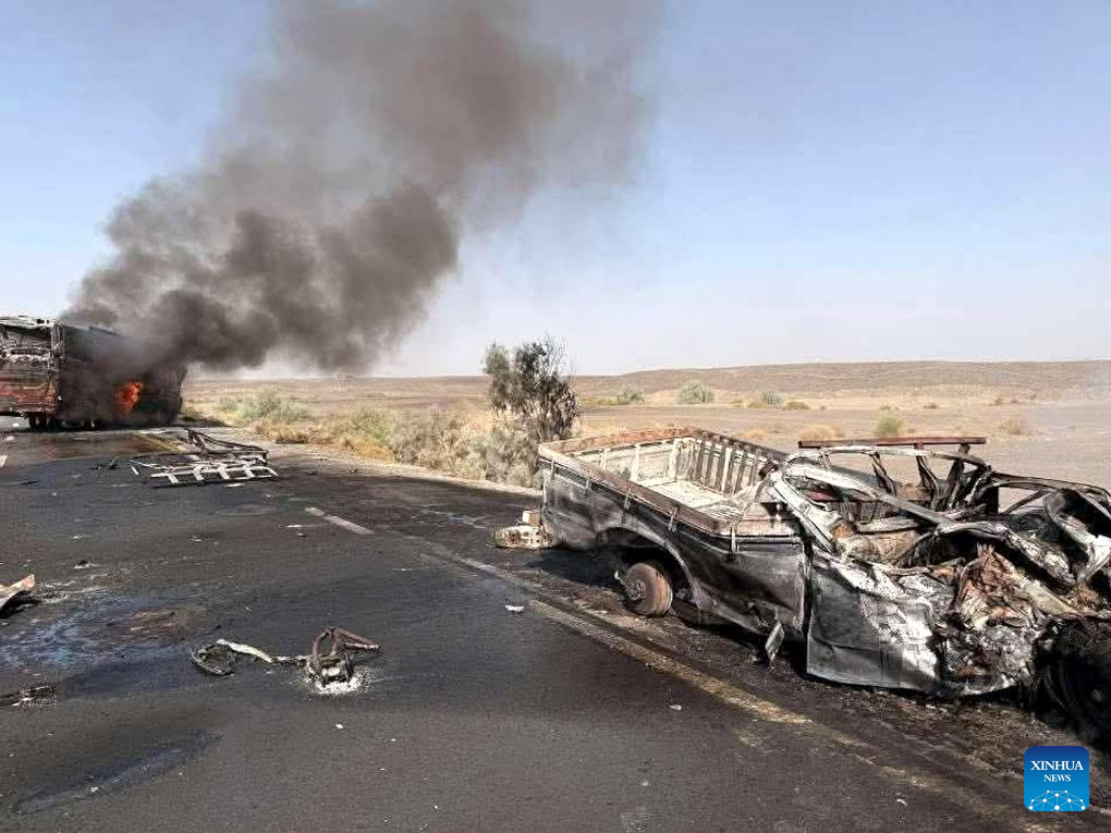 This photo taken with a mobile phone shows the road accident site in Panjgur district of Pakistan's southwest Balochistan province on Sept. 27, 2025.