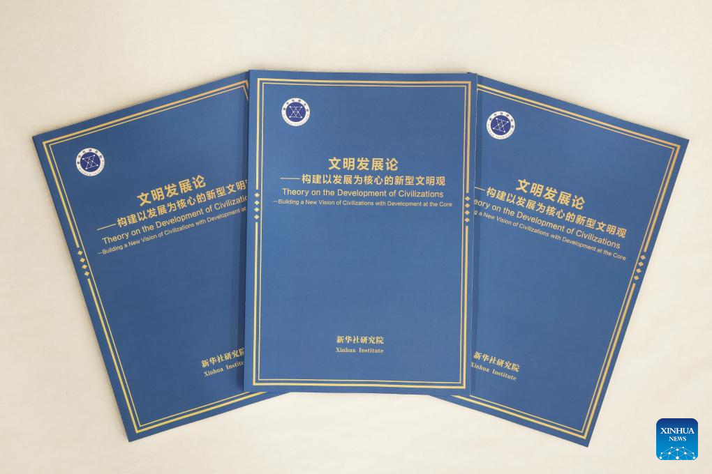 This photo shows copies of the think tank report "Theory on the Development of Civilizations -- Building a New Vision of Civilizations with Development at the Core." The report was released by Xinhua Institute, a think tank affiliated with Xinhua News Agency, at the International Academic Symposium on Xi Jinping Thought on Culture held in Guangzhou of south China's Guangdong Province on Saturday. The theory emphasizes the independence, inclusiveness and innovation of civilizations, with governance for the people as the foundation of development. The report states that the theory shapes a new paradigm for human civilization. (Xinhua/Liu Dawei)