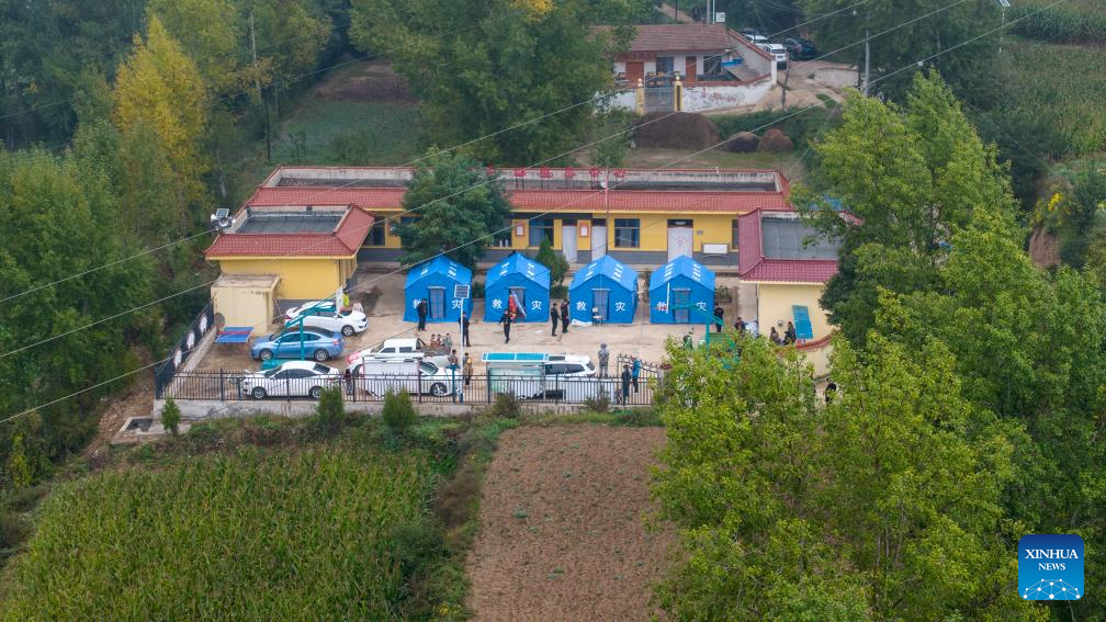 An aerial drone photo taken on Sept. 27, 2025 shows tents at Zhongshan Village of Wenfeng Town in Longxi County, Dingxi City, northwest China's Gansu Province. A 5.6-magnitude earthquake struck Longxi County in Dingxi City in northwest China's Gansu Province at 5:49 a.m. Saturday, according to the China Earthquake Networks Center (CENC).