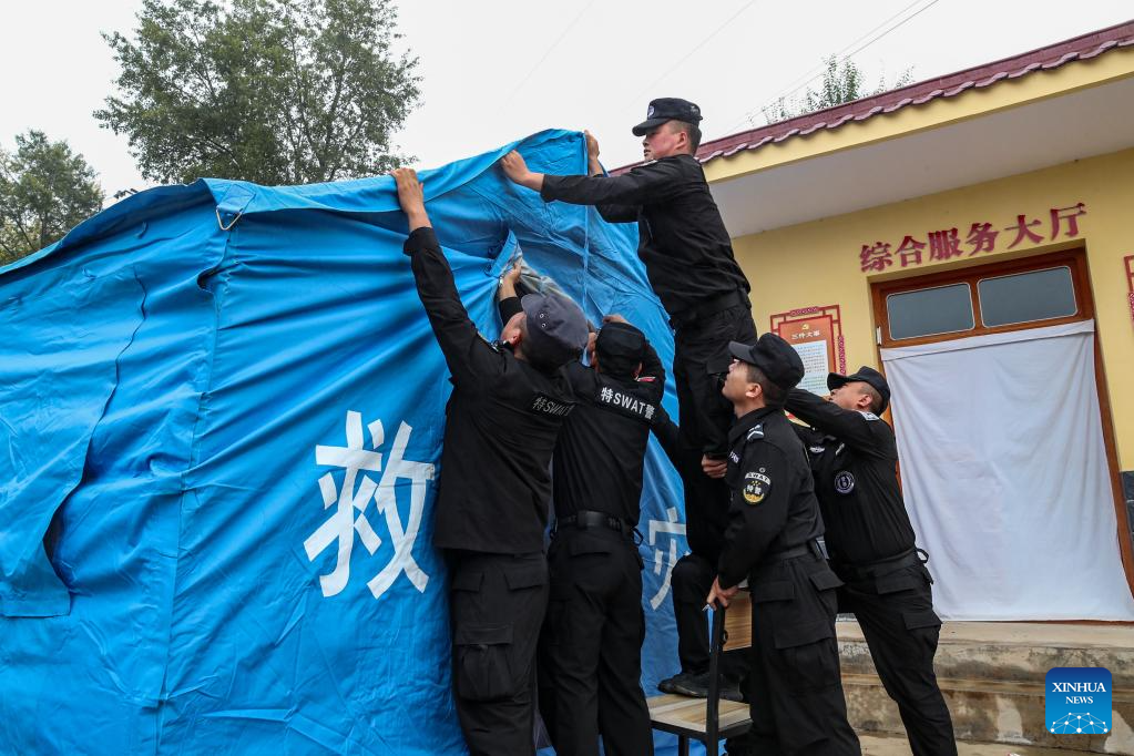 Police officers set up a tent at Zhongshan Village of Wenfeng Town in Longxi County, Dingxi City, northwest China's Gansu Province, Sept. 27, 2025. A 5.6-magnitude earthquake struck Longxi County in Dingxi City in northwest China's Gansu Province at 5:49 a.m. Saturday, according to the China Earthquake Networks Center (CENC).