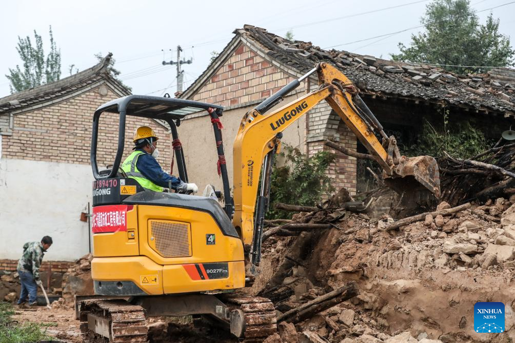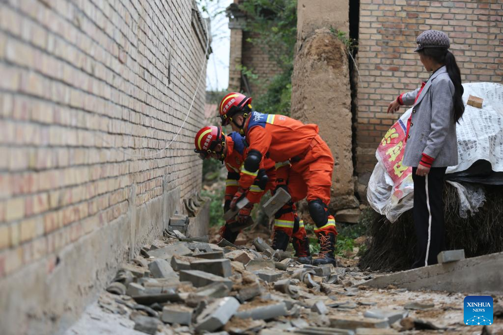 Rescuers conduct risk inspections at Hualin Village of Wenfeng Town in Longxi County, Dingxi City, northwest China's Gansu Province, Sept. 27, 2025. A 5.6-magnitude earthquake struck Longxi County in Dingxi City in northwest China's Gansu Province at 5:49 a.m. Saturday, the China Earthquake Networks Center (CENC) said. (Photo by Wang Kexian/Xinhua)