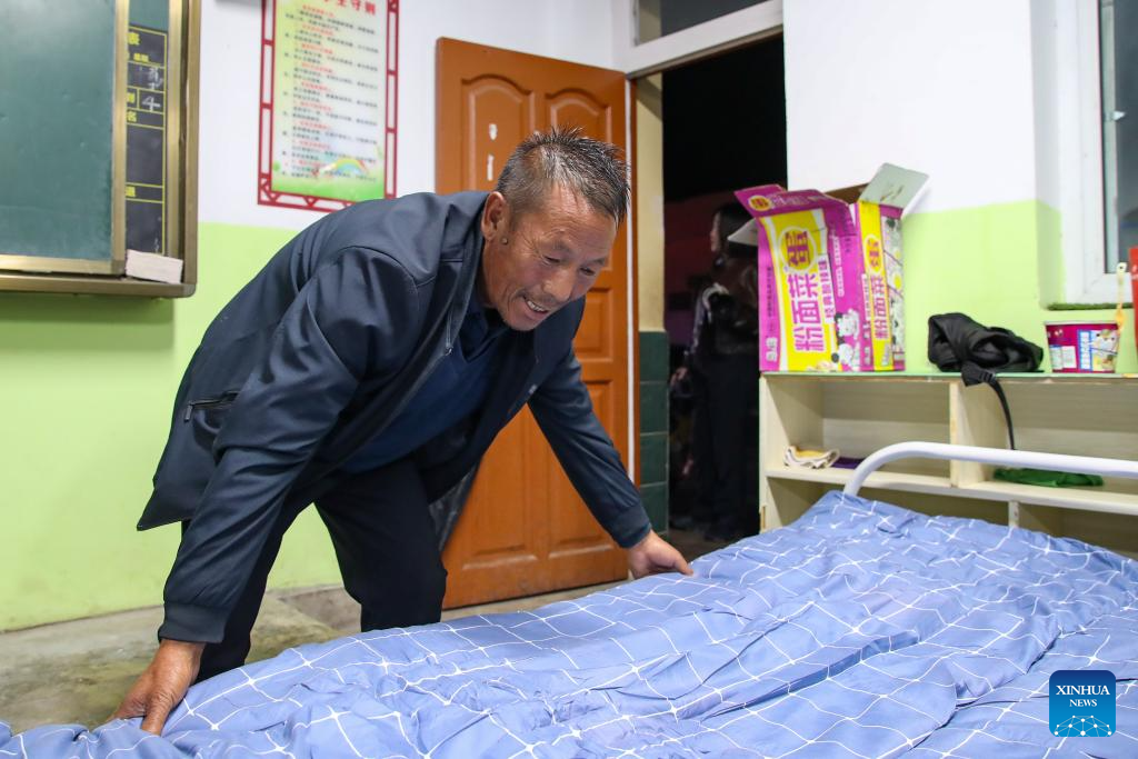 Volunteers help the quake-affected people make the beds at a relocation site in Zhangxian County, Dingxi City, northwest China's Gansu Province, Sept. 28, 2025.(Xinhua/Lang Bingbing)