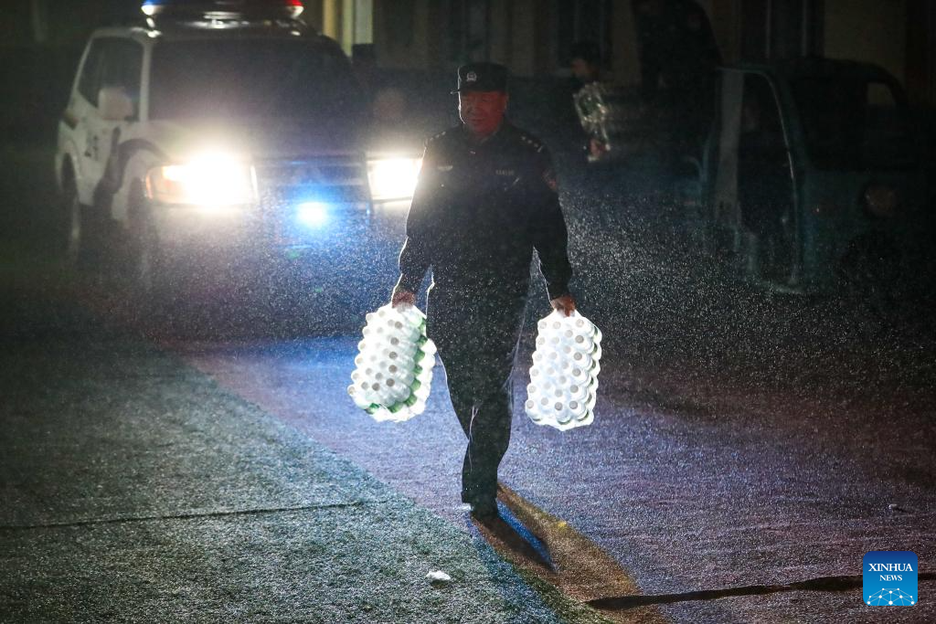 A police officer carries quake relief supplies at a temporary shelter in Xianjiamen Village in Wenfeng Township of Longxi County, northwest China's Gansu Province, Sept. 27, 2025.