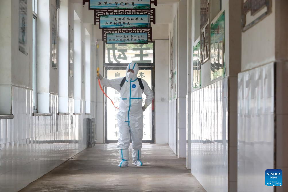 A staff member conducts disinfection operations at a relocation site in Zhangxian County, Dingxi City, northwest China's Gansu Province, Sept. 28, 2025.(Xinhua/Lang Bingbing)