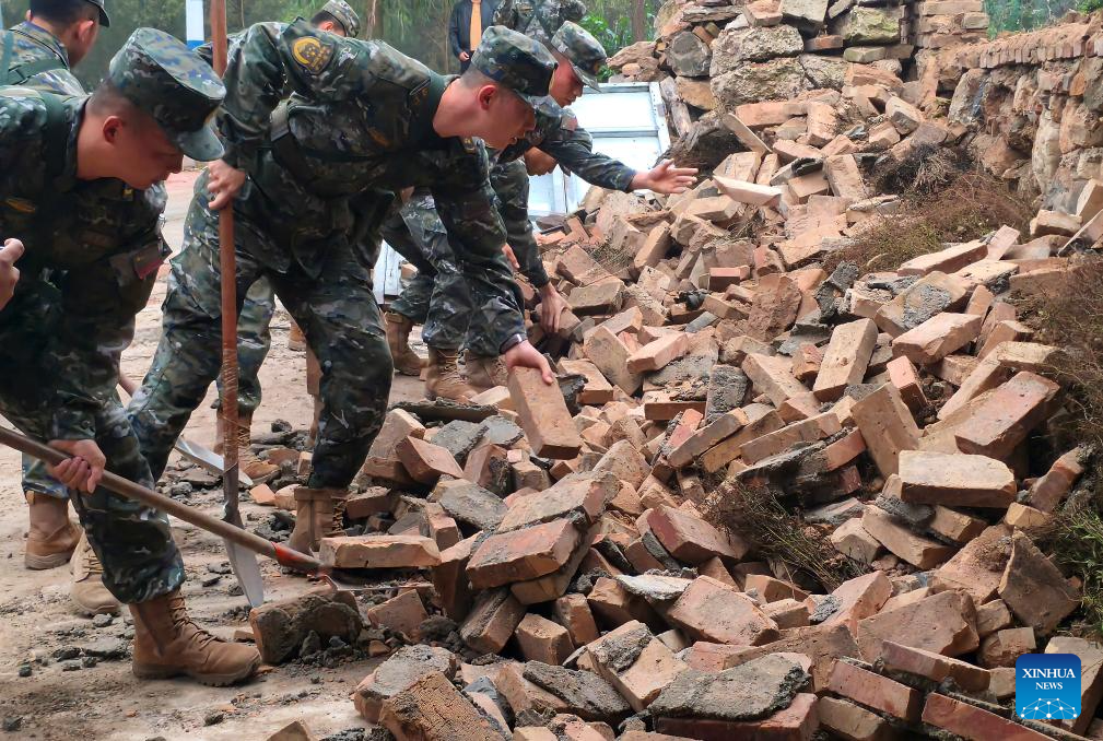 Rescuers carry out rescue operations at Hualin Village of Wenfeng Town in Longxi County, Dingxi City, northwest China's Gansu Province, Sept. 27, 2025. A 5.6-magnitude earthquake struck Longxi County in Dingxi City in northwest China's Gansu Province at 5:49 a.m. Saturday, the China Earthquake Networks Center (CENC) said. (Photo by Wang Kexian/Xinhua)