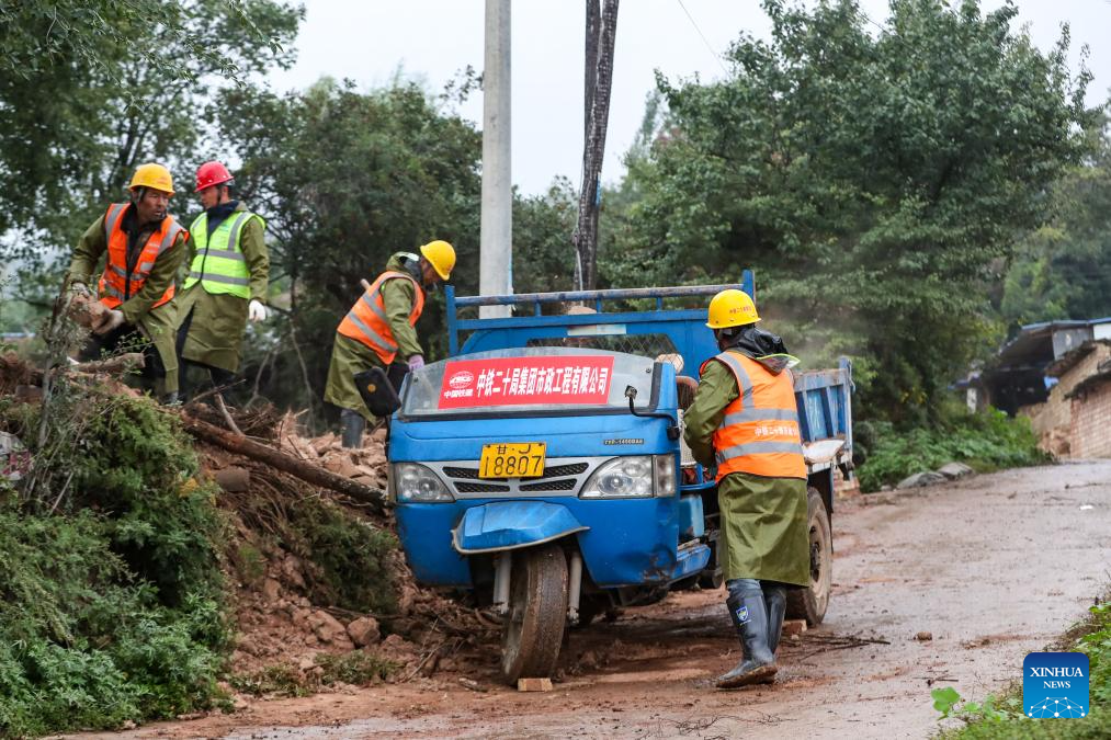 Rescuers carry out clearance and risk removal operations at Wangjiahe Village in Zhangxian County, Dingxi City, northwest China's Gansu Province, Sept. 28, 2025.(Xinhua/Lang Bingbing)