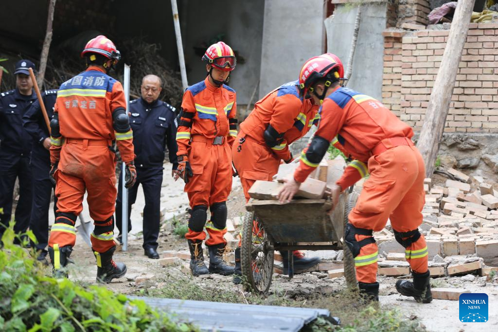 Rescuers carry out rescue operations at Hualin Village of Wenfeng Town in Longxi County, Dingxi City, northwest China's Gansu Province, Sept. 27, 2025. A 5.6-magnitude earthquake struck Longxi County in Dingxi City in northwest China's Gansu Province at 5:49 a.m. Saturday, the China Earthquake Networks Center (CENC) said. (Photo by Hou Chonghui/Xinhua)