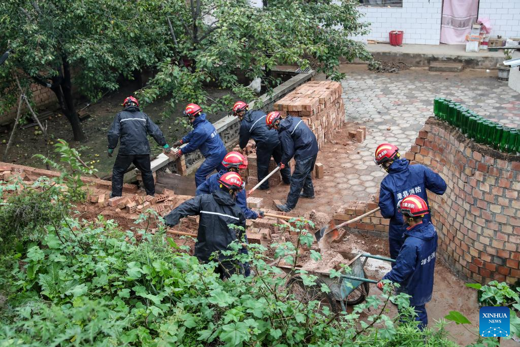 Firefighters conduct risk-removal operations at Wangjiahe Village in Zhangxian County, Dingxi City, northwest China's Gansu Province, Sept. 28, 2025.(Xinhua/Lang Bingbing)