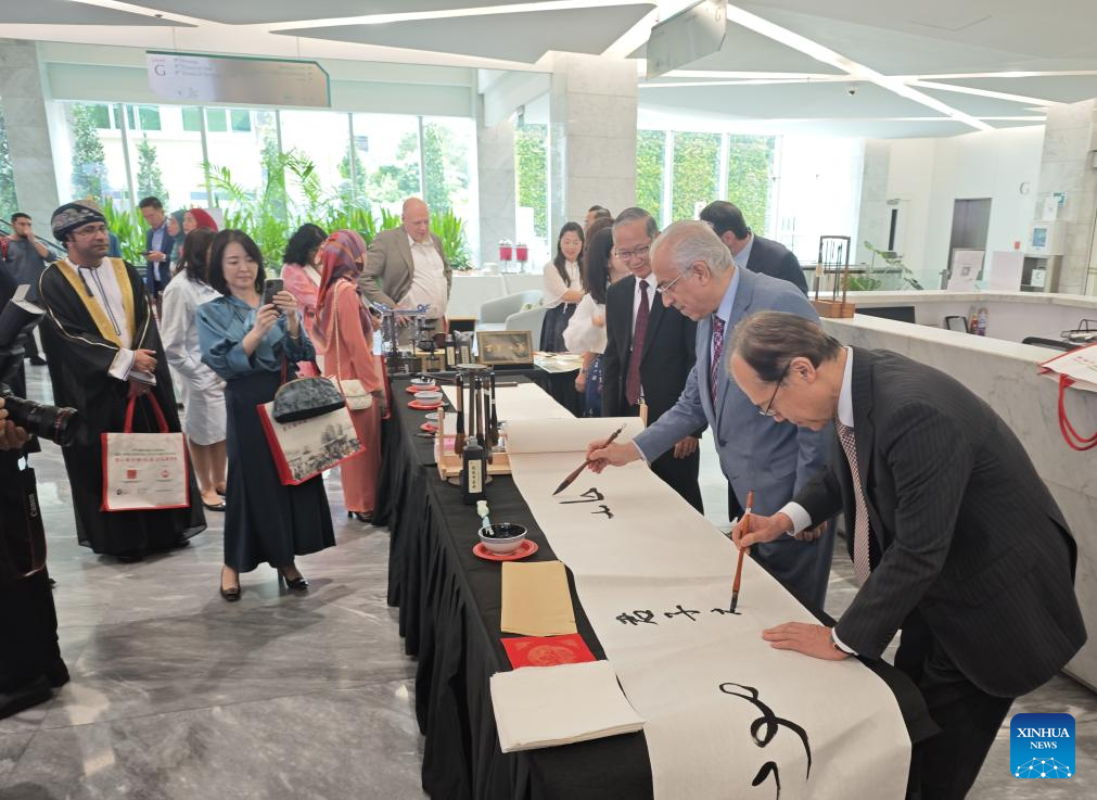 Guests try Chinese calligraphy during the Brunei-China Art and Visual Culture Festival 2025 held near Bandar Seri Begawan, Brunei, on Sept. 27, 2025. The Brunei-China Art and Visual Culture Festival 2025 is being held on Saturday and Sunday near the capital Bandar Seri Begawan to celebrate friendship and cultural exchange between the two countries. The event features a Brunei-China calligraphy and painting exhibition and an art exhibition. (Chinese Embassy in Brunei/Handout via Xinhua)