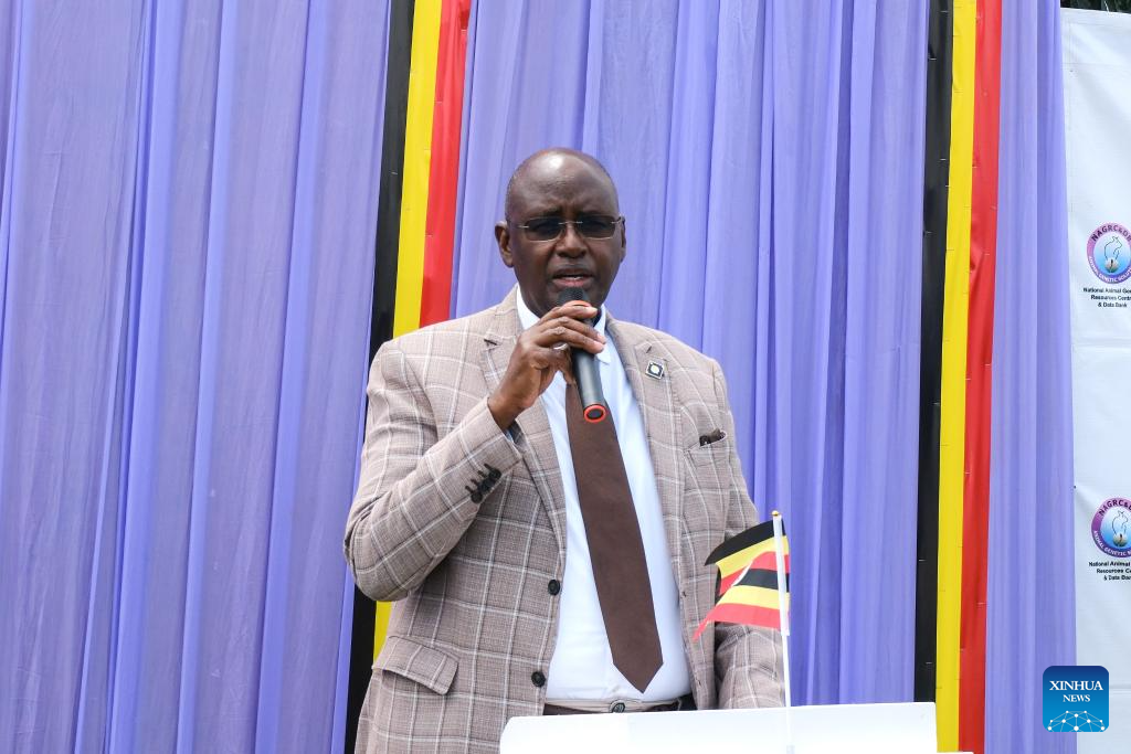 Bright Rwamirama, Uganda's minister for animal industry, speaks during the handover ceremony of the nine Jianzhou big-eared goats from China to Uganda at the National Animal Genetic Resources Centre and Data Bank, in Entebbe, Uganda, on Sept. 25, 2025. (Photo by Hajarah Nalwadda/Xinhua)