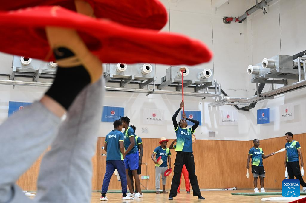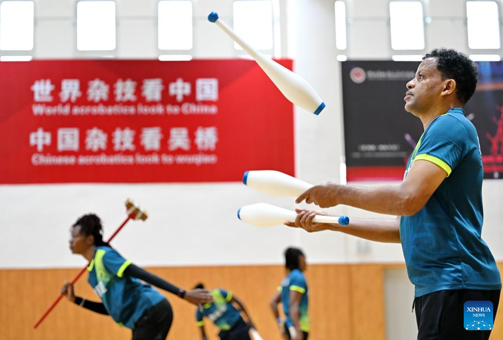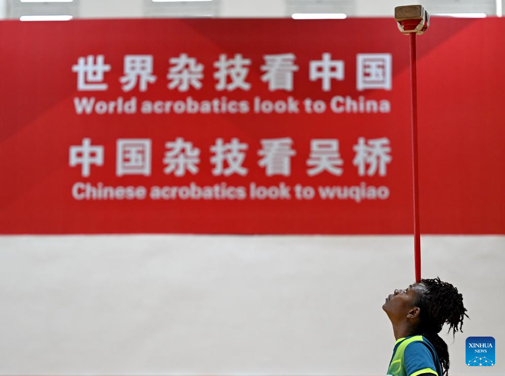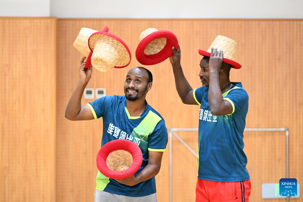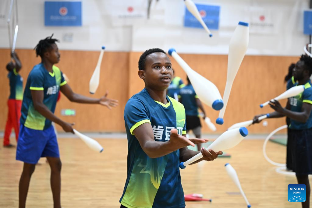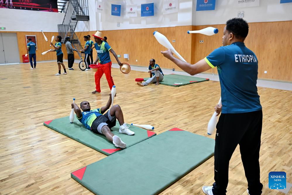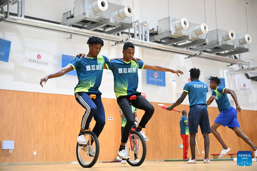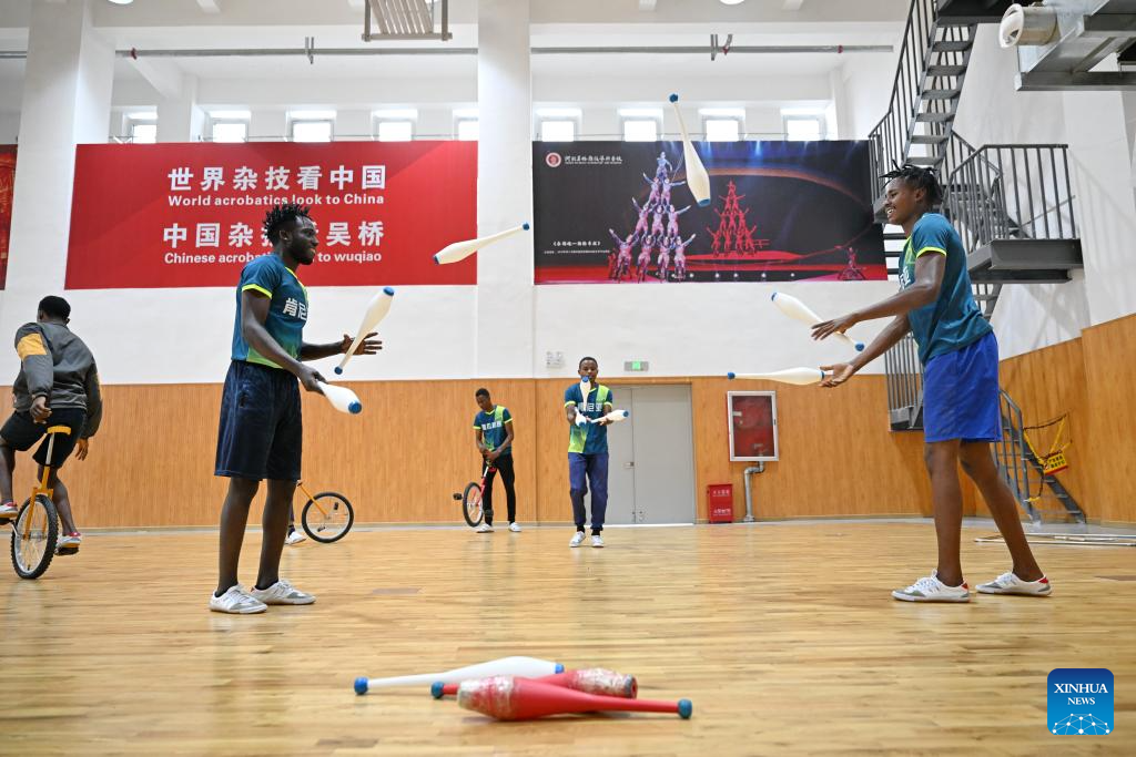 Trainees from Ethiopia practice acrobatics at Hebei Wuqiao Acrobatic Art School in Wuqiao County, north China's Hebei Province, Sept. 28, 2025. Hebei Wuqiao Acrobatic Art School recently welcomed 27 international students from countries including Kenya and Vietnam for a two-month training program. The school has been providing training for foreign acrobatic students for 23 years, with a total of over 700 trainees to date. (Xinhua/Mu Yu)