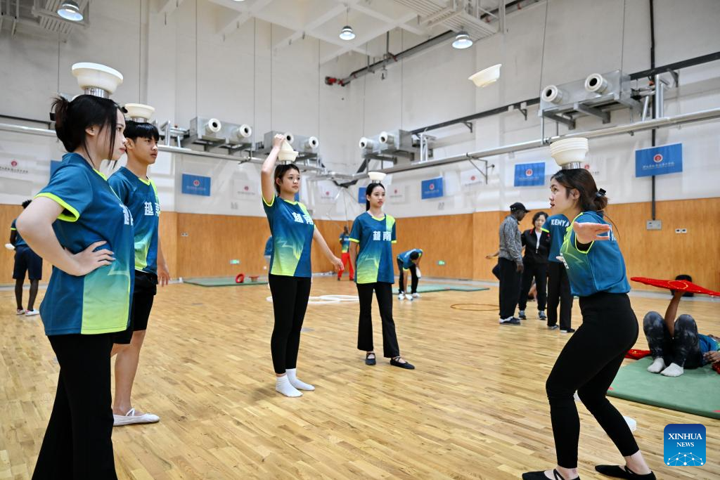 Trainees practice acrobatics at Hebei Wuqiao Acrobatic Art School in Wuqiao County, north China's Hebei Province, Sept. 28, 2025. Hebei Wuqiao Acrobatic Art School recently welcomed 27 international students from countries including Kenya and Vietnam for a two-month training program. The school has been providing training for foreign acrobatic students for 23 years, with a total of over 700 trainees to date. (Xinhua/Mu Yu)