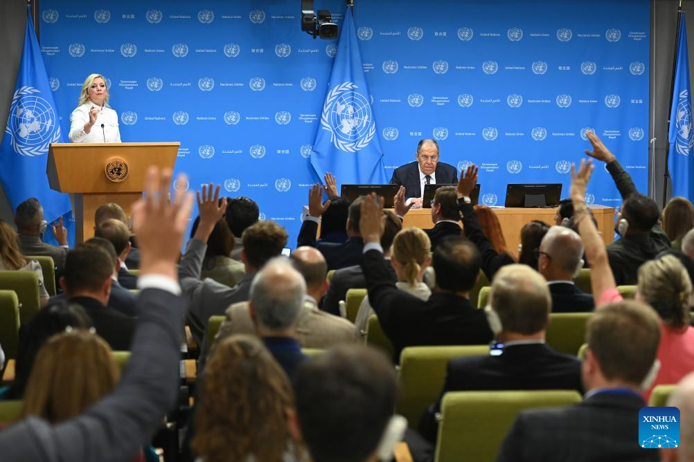 Russian Foreign Minister Sergei Lavrov attends a press conference after delivering a speech during the General Debate of the 80th session of the United Nations General Assembly (UNGA) at the UN headquarters in New York on Sept. 27, 2025.