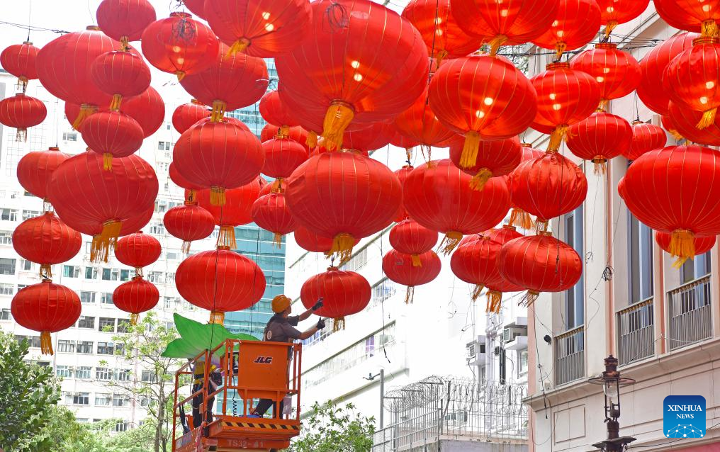 Staff members hang decorative lanterns in south China's Hong Kong, Sept. 28, 2025. With the approach of National Day and the Mid-Autumn Festival, the streets of Hong Kong are adorned with festive decorations. (Xinhua/Chen Duo)