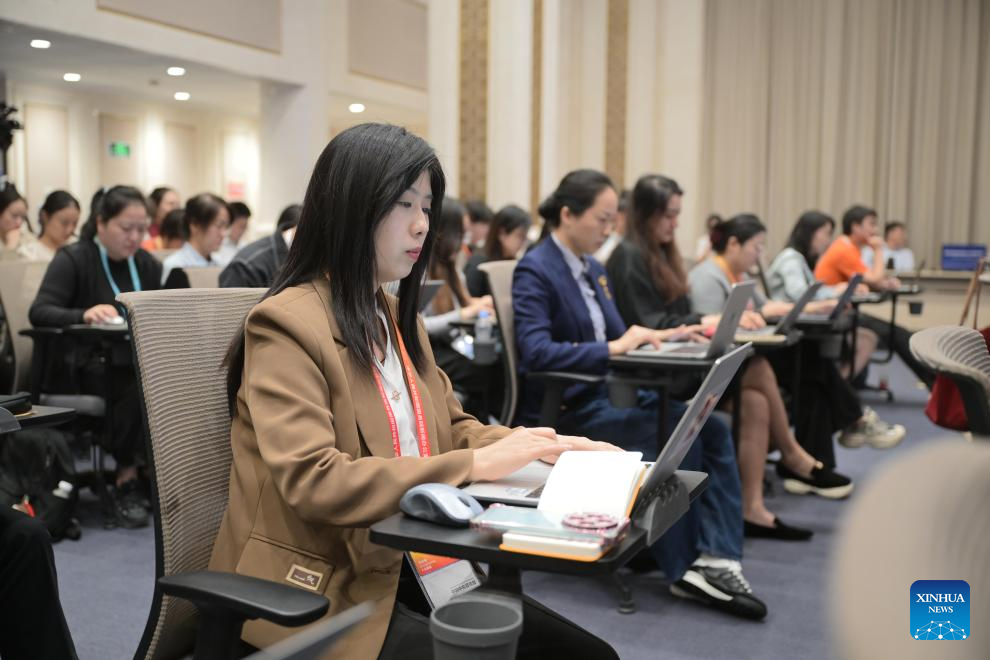 Journalists work at a press conference held by the State Council Information Office (SCIO) on achievements in high-quality development of culture and tourism during the 14th Five-Year Plan period (2021-2025) in Beijing, capital of China, Sept. 29, 2025. Sun Yeli, deputy head of the Publicity Department of the Communist Party of China Central Committee and minister of culture and tourism, and Lu Yingchuan and Wang Jianhua, both vice ministers of culture and tourism, attended the press conference here on Monday. (Xinhua/Chen Yehua)