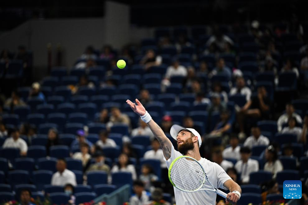 Corentin Moutet serves during the men's singles second round match between Corentin Moutet of France and Alexander Zverev of Germany at 2025 China Open tennis tournament in Beijing, China, Sept. 28, 2025. (Xinhua/Xin Mengchen)