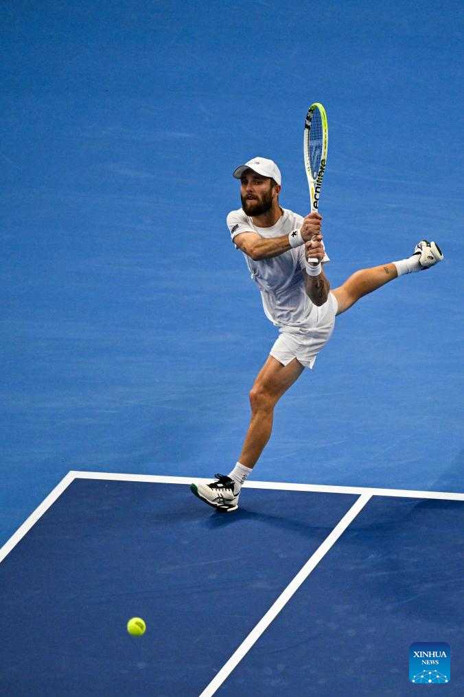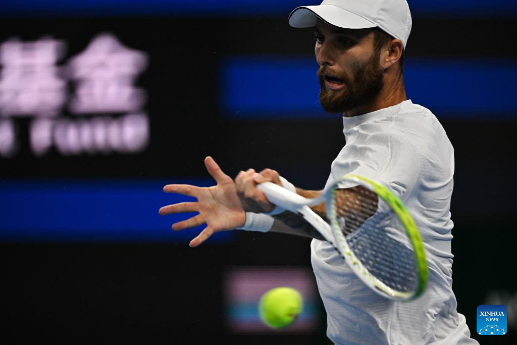 Corentin Moutet returns a shot during the men's singles second round match between Corentin Moutet of France and Alexander Zverev of Germany at 2025 China Open tennis tournament in Beijing, China, Sept. 28, 2025. (Xinhua/Xin Mengchen)