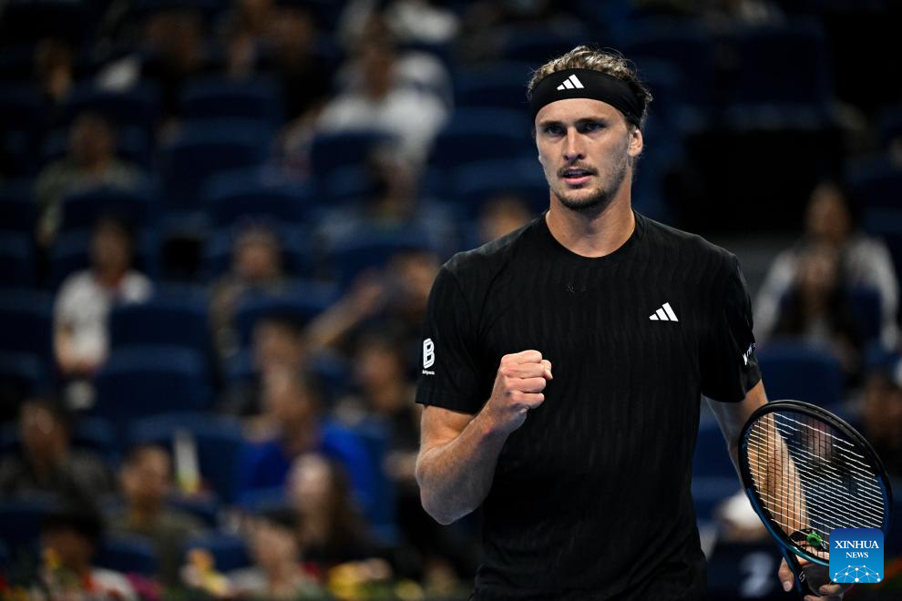 Alexander Zverev celebrates during the men's singles second round match between Corentin Moutet of France and Alexander Zverev of Germany at 2025 China Open tennis tournament in Beijing, China, Sept. 28, 2025. (Xinhua/Xin Mengchen)