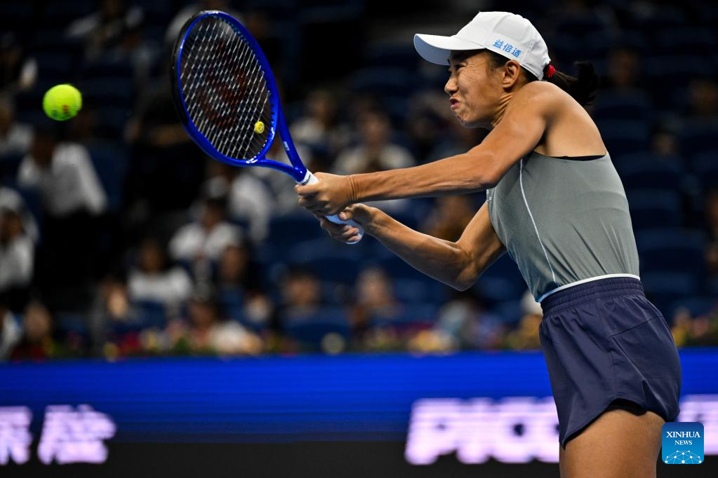 Zhuang Shuai hits a return during the women's singles third round match between Zhang Shuai of China and Amanda Anisimova of the United States at 2025 China Open tennis tournament in Beijing, China, Sept. 28, 2025. (Xinhua/Xin Mengchen)