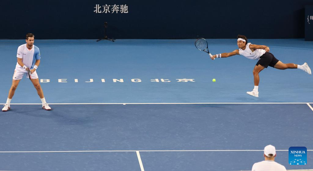 Bu Yunchaokete (R)/Cameron Norrie compete during the men's doubles quarterfinal match between Bu Yunchaokete (China)/Cameron Norrie (Britain) and Harri Heliovaara (Finland)/Henry Patten (Britain) at 2025 China Open tennis tournament in Beijing, China, Sept. 28, 2025. (Photo by Ma Zihan/Xinhua)