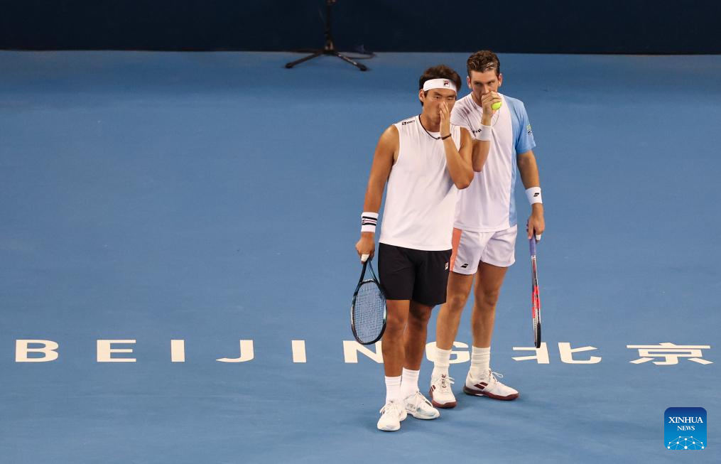 Bu Yunchaokete/Cameron Norrie (R) communicate with each other during the men's doubles quarterfinal match between Bu Yunchaokete (China)/Cameron Norrie (Britain) and Harri Heliovaara (Finland)/Henry Patten (Britain) at 2025 China Open tennis tournament in Beijing, China, Sept. 28, 2025. (Photo by Ma Zihan/Xinhua)