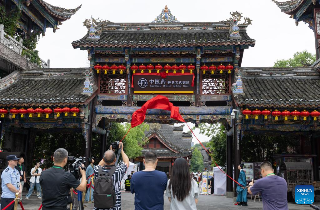 People visit the Traditional Chinese Medicine (TCM) Street in Bishan District, southwest China's Chongqing Municipality, Sept. 30, 2025. The Traditional Chinese Medicine Street, a cultural block featuring traditional Chinese medicine, opened to public on Tuesday. Characteristic cultural fairs, free TCM clinics, and Qigong performances will be held here during the upcoming National Day holiday and the Mid-Autumn Festival. (Xinhua/Chen Cheng)