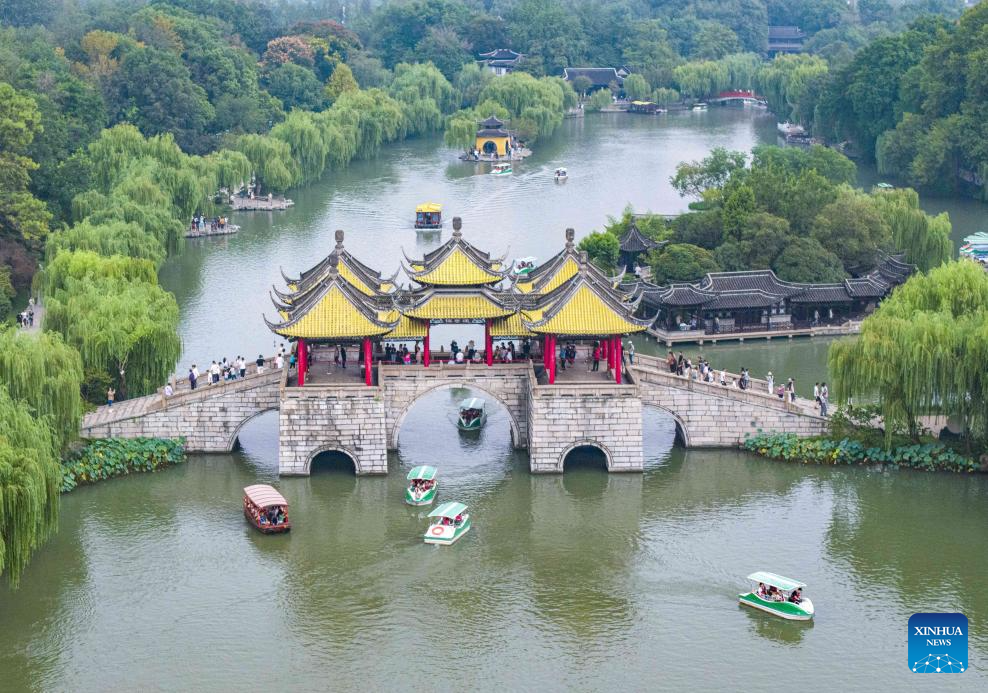 An aerial drone photo taken on Oct. 1, 2025 shows tourists taking boat at the Slender West Lake scenic spot in Yangzhou, east China's Jiangsu Province. This year, with China's Mid-Autumn Festival falling alongside National Day, an eight-day holiday starting Wednesday is set to energize local economies through a surge in cultural tourism. (Photo by Ren Fei/Xinhua)