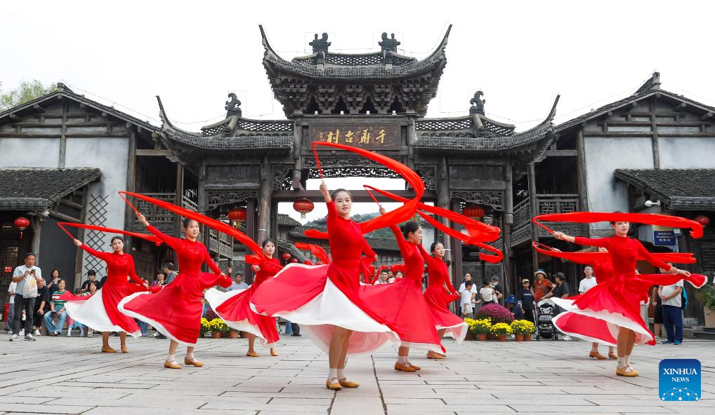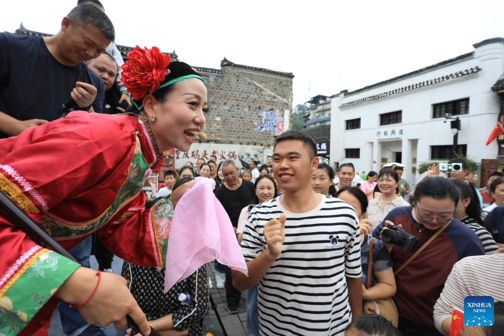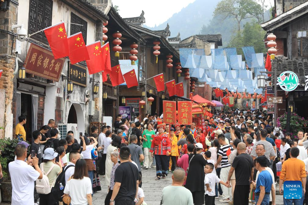 Tourists watch a wedding custom performance of Tujia ethnic group at an ancient town in Xiushan Tujia and Miao Autonomous County, southwest China's Chongqing Municipality, Oct. 1, 2025. This year, with China's Mid-Autumn Festival falling alongside National Day, an eight-day holiday starting Wednesday is set to energize local economies through a surge in cultural tourism. (Photo by Hu Cheng/Xinhua)