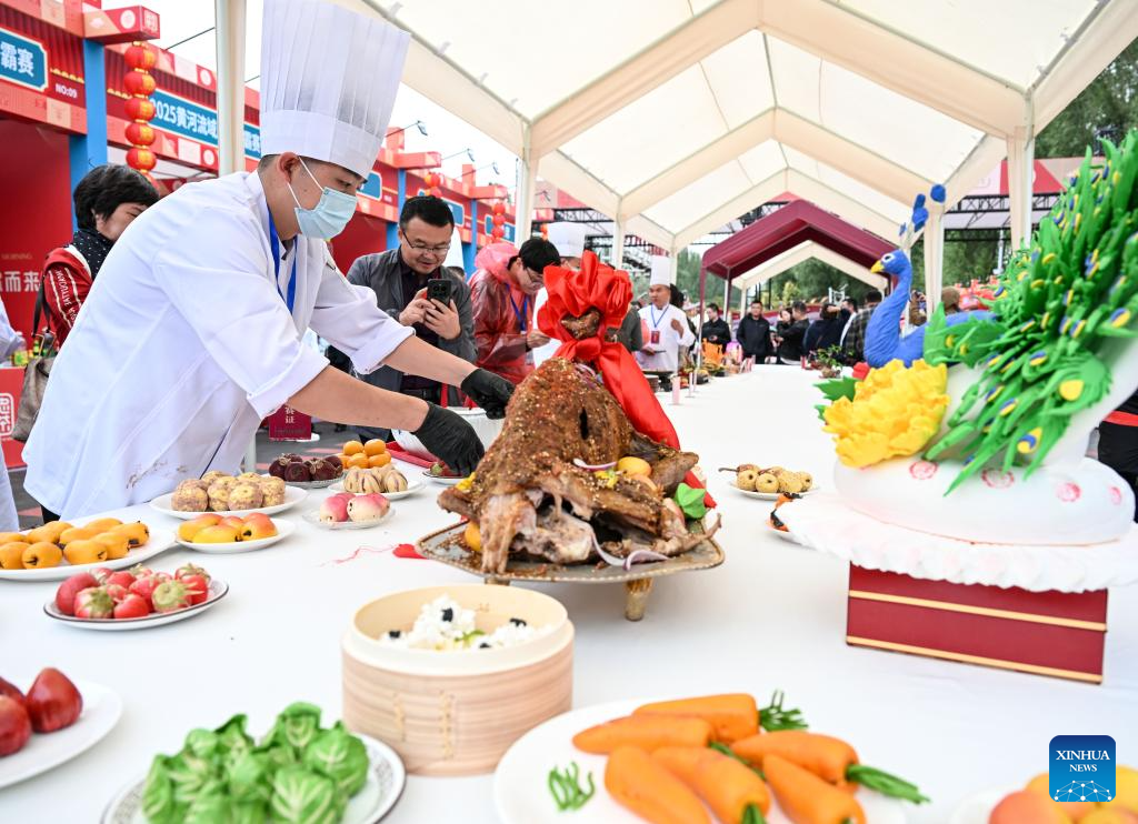 A chef prepares dishes for tourists during a culinary competition at a morning-tea food culture festival in Wuzhong City, northwest China's Ningxia Hui Autonomous Region, Oct. 1, 2025. This year, with China's Mid-Autumn Festival falling alongside National Day, an eight-day holiday starting Wednesday is set to energize local economies through a surge in cultural tourism. (Xinhua/Feng Kaihua)