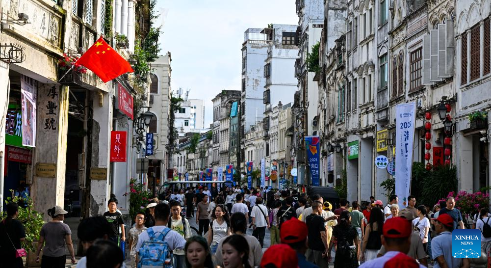 Tourists visit the Qilou old street in Haikou, south China's Hainan Province, Oct. 1, 2025. This year, with China's Mid-Autumn Festival falling alongside National Day, an eight-day holiday starting Wednesday is set to energize local economies through a surge in cultural tourism. (Xinhua/Yang Guanyu)
