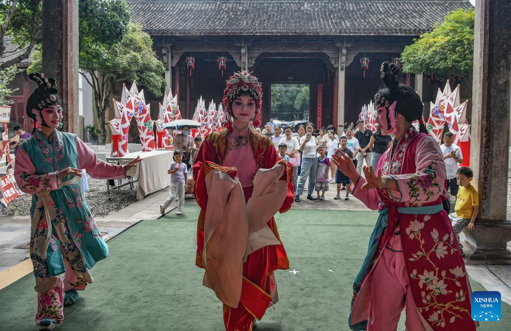 Tourists watch a Wuju Opera performance in Jinhua City, east China's Zhejiang Province, Oct. 1, 2025. This year, with China's Mid-Autumn Festival falling alongside National Day, an eight-day holiday starting Wednesday is set to energize local economies through a surge in cultural tourism. (Photo by Shi Kuanbing/Xinhua)