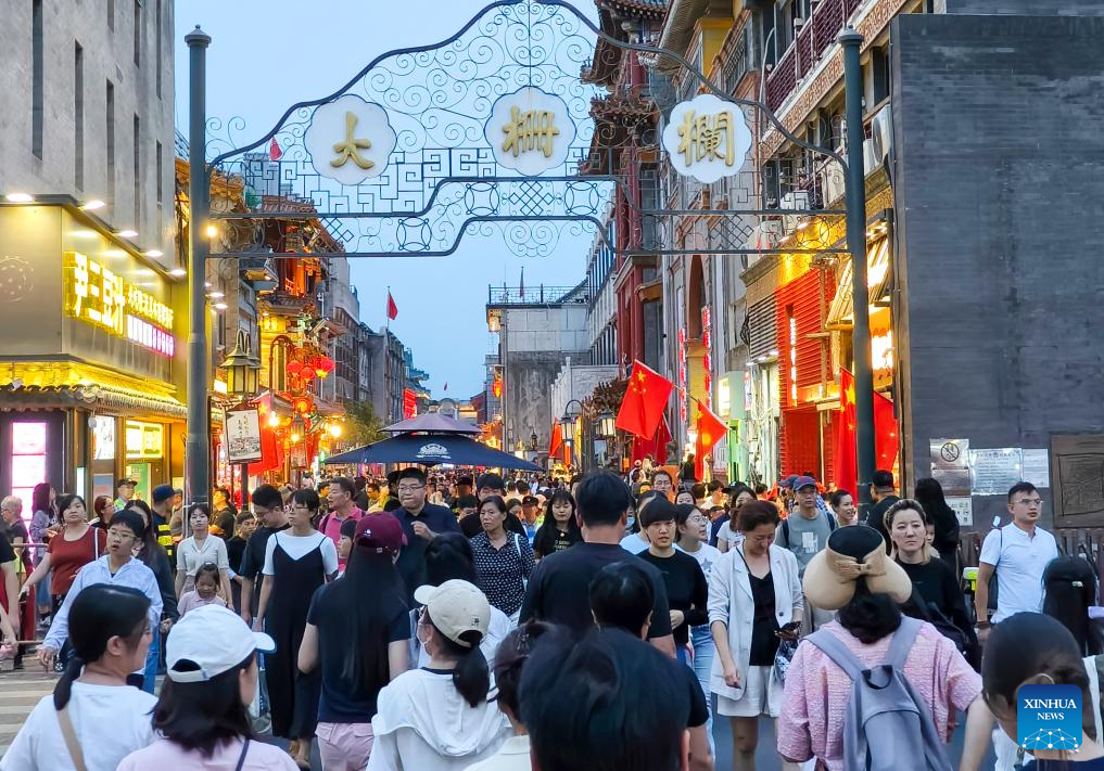 This photo taken with a mobile phone on Oct. 1, 2025 shows people visiting the Dashilan shopping area in Beijing, capital of China. This year, with China's Mid-Autumn Festival falling alongside National Day, an eight-day holiday starting Wednesday is set to energize local economies through a surge in cultural tourism. (Xinhua/Chen Yehua)