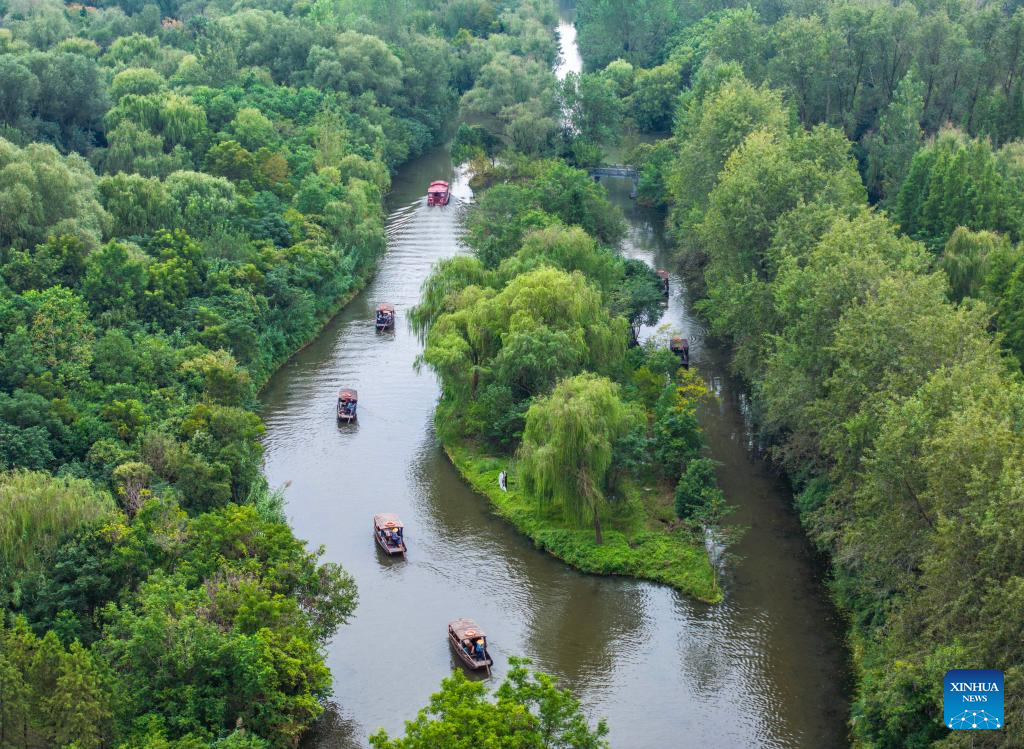 An aerial drone photo taken on Oct. 1, 2025 shows tourists taking boat at Qinhu National Wetland Park in Jiangyan District of Taizhou, east China's Jiangsu Province. This year, with China's Mid-Autumn Festival falling alongside National Day, an eight-day holiday starting Wednesday is set to energize local economies through a surge in cultural tourism. (Photo by Zhou Shegen/Xinhua)