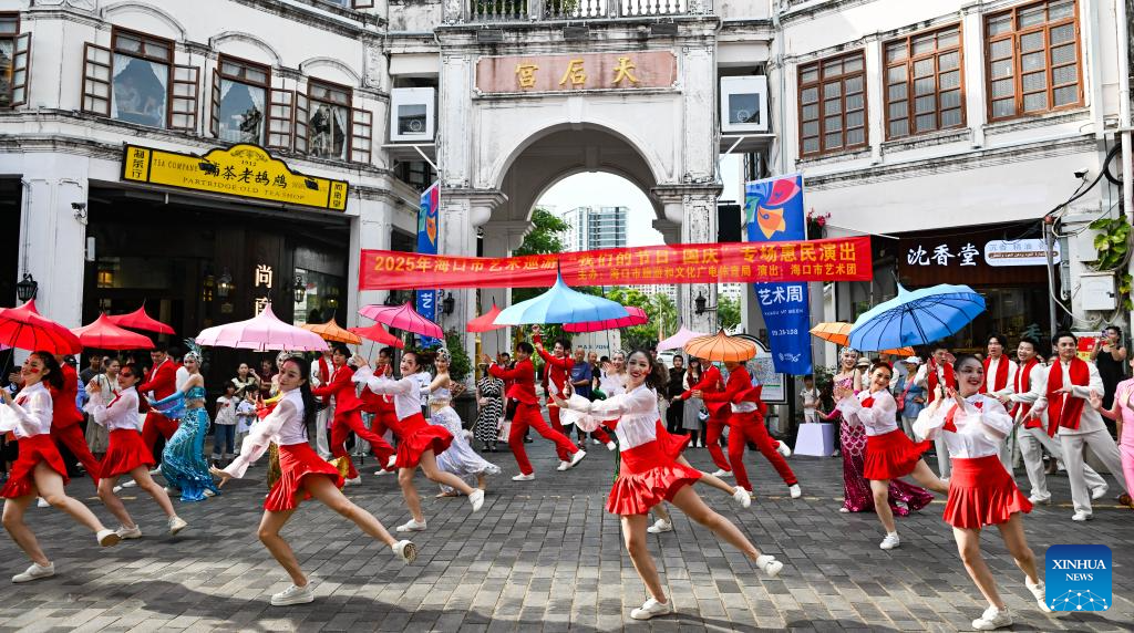 Artists performs for tourists at the Qilou old street in Haikou, south China's Hainan Province, Oct. 1, 2025. This year, with China's Mid-Autumn Festival falling alongside National Day, an eight-day holiday starting Wednesday is set to energize local economies through a surge in cultural tourism. (Xinhua/Yang Guanyu)