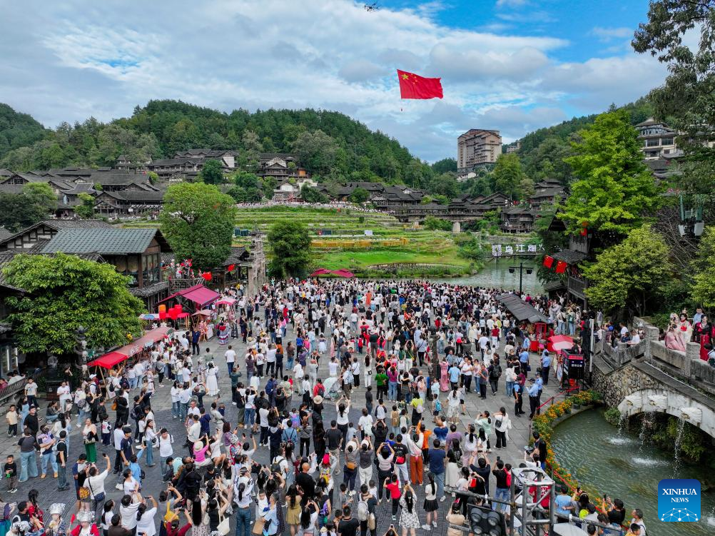 Tourists experience folk customs at an ancient town in Xiushan Tujia and Miao Autonomous County, southwest China's Chongqing Municipality, Oct. 1, 2025. This year, with China's Mid-Autumn Festival falling alongside National Day, an eight-day holiday starting Wednesday is set to energize local economies through a surge in cultural tourism. (Photo by Hu Cheng/Xinhua)