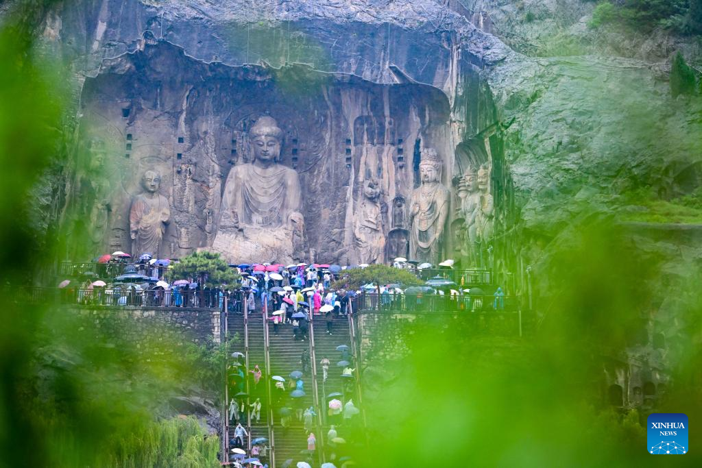 People visit the Longmen Grottoes scenic spot in Luoyang City, central China's Henan Province, Oct. 1, 2025. This year, with China's Mid-Autumn Festival falling alongside National Day, an eight-day holiday starting Wednesday is set to energize local economies through a surge in cultural tourism. (Photo by Li Weichao/Xinhua)