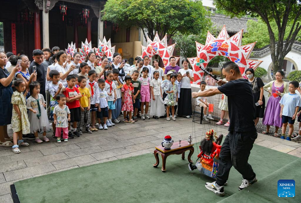 Tourists watch a string puppetry show in Jinhua City, east China's Zhejiang Province, Oct. 1, 2025. This year, with China's Mid-Autumn Festival falling alongside National Day, an eight-day holiday starting Wednesday is set to energize local economies through a surge in cultural tourism. (Photo by Shi Kuanbing/Xinhua)
