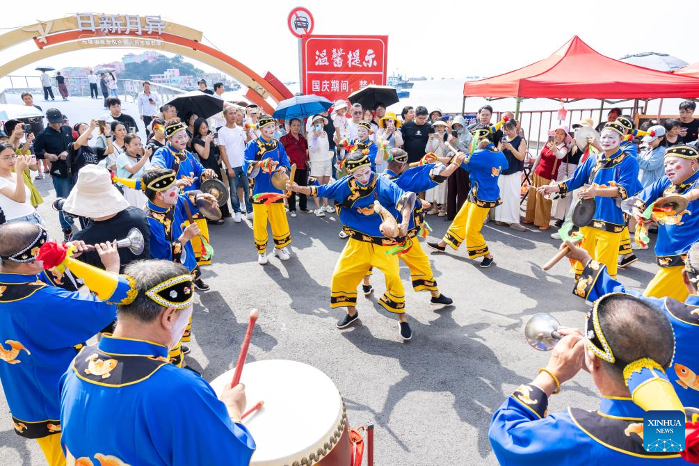 Tourists watch a folk performance at a village pier in Shitang Town of Wenling City, east China's Zhejiang Province, Oct. 1, 2025. This year, with China's Mid-Autumn Festival falling alongside National Day, an eight-day holiday starting Wednesday is set to energize local economies through a surge in cultural tourism. (Photo by Xu Weijie/Xinhua)