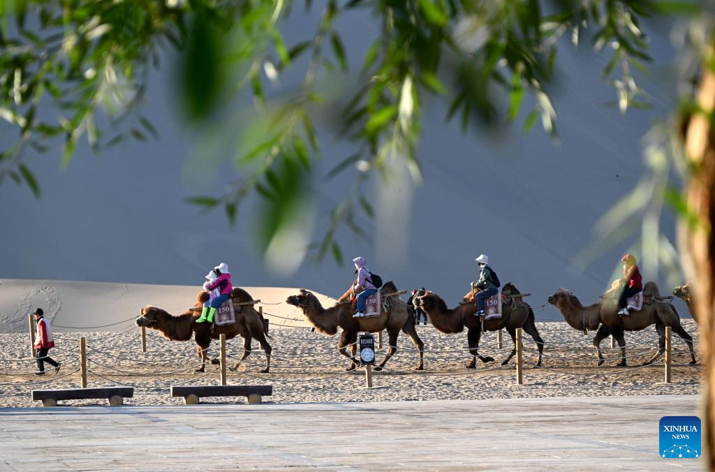 Tourists visit the Mingsha Mountain and Crescent Spring scenic spot in Dunhuang City, northwest China's Gansu Province, Oct. 1, 2025. This year, with China's Mid-Autumn Festival falling alongside National Day, an eight-day holiday starting Wednesday is set to energize local economies through a surge in cultural tourism. (Photo by Zhang Xiaoliang/Xinhua)