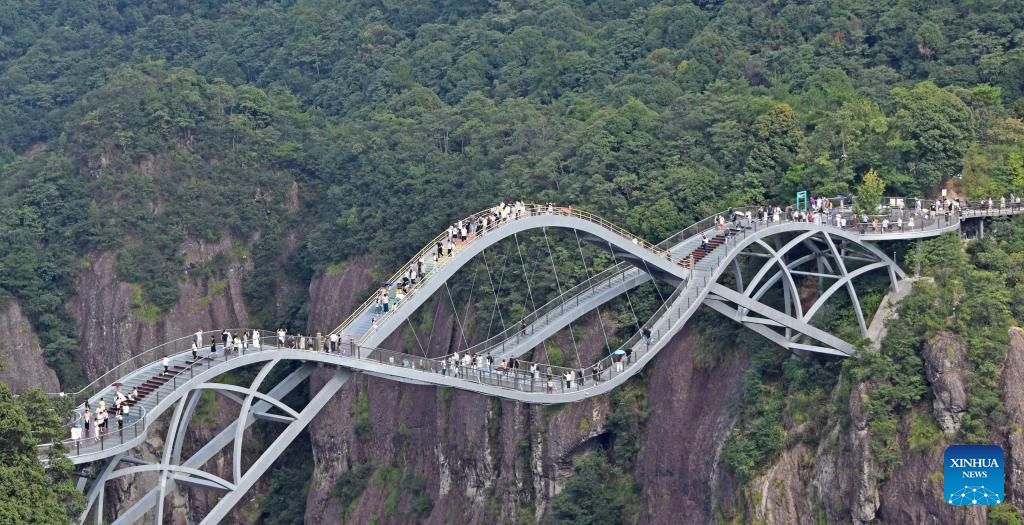 An aerial drone photo taken on Oct. 1, 2025 shows tourists visiting the Shenxianju scenic spot in Taizhou, east China's Zhejiang Province. This year, with China's Mid-Autumn Festival falling alongside National Day, an eight-day holiday starting Wednesday is set to energize local economies through a surge in cultural tourism. (Photo by Wang Huabin/Xinhua)