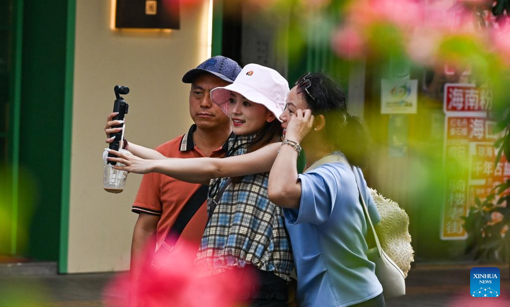 Tourists pose for a selfie at the Qilou old street in Haikou, south China's Hainan Province, Oct. 1, 2025. This year, with China's Mid-Autumn Festival falling alongside National Day, an eight-day holiday starting Wednesday is set to energize local economies through a surge in cultural tourism. (Xinhua/Yang Guanyu)