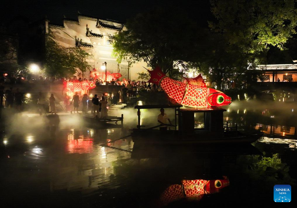 A drone photo taken on Oct. 1, 2025 shows a fish lantern parade in Yixian County of Huangshan City, east China's Anhui Province. This year, with China's Mid-Autumn Festival falling alongside National Day, an eight-day holiday starting Wednesday is set to energize local economies through a surge in cultural tourism. (Xinhua/Du Yu)