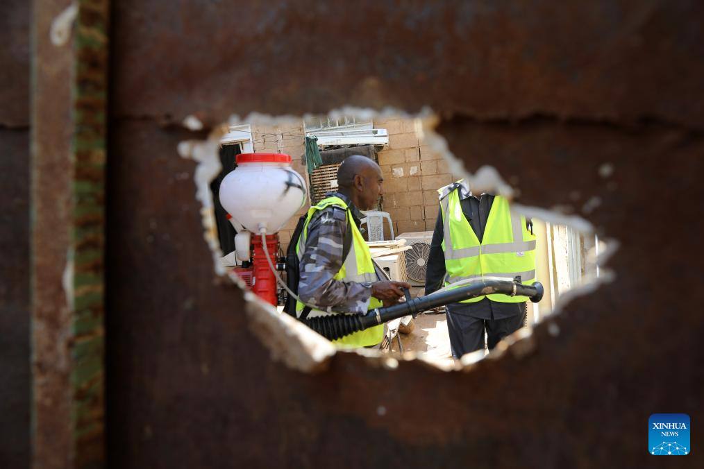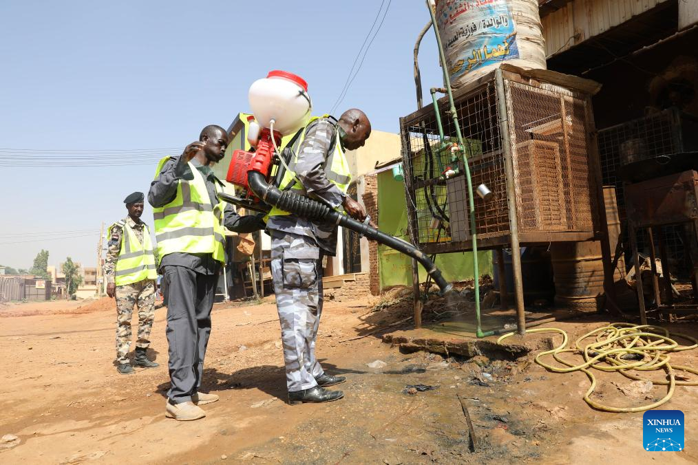 Members of the Sudanese Civil Defense Forces spray insecticide at Al-Waha neighborhood of Omdurman city, north of the Sudanese capital Khartoum, Sept. 30, 2025. Since the beginning of the year, Sudan has faced an outbreak of dengue fever, a viral illness that could be lethal for those infected, with Khartoum being an epicenter. The Sudanese Civil Defense Forces launched an environmental sanitation campaign on Tuesday in the Al-Waha neighborhood of Omdurman city to combat disease vectors, especially mosquitoes, amid a widespread dengue fever outbreak. (Photo by Mohamed Khidir/Xinhua)