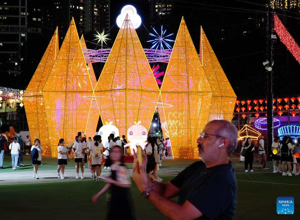 People visit a lantern fair marking the upcoming Mid-Autumn Festival and National Day at Victoria Park in Hong Kong, south China, Sept. 30, 2025. (Photo by Wang Shen/Xinhua)